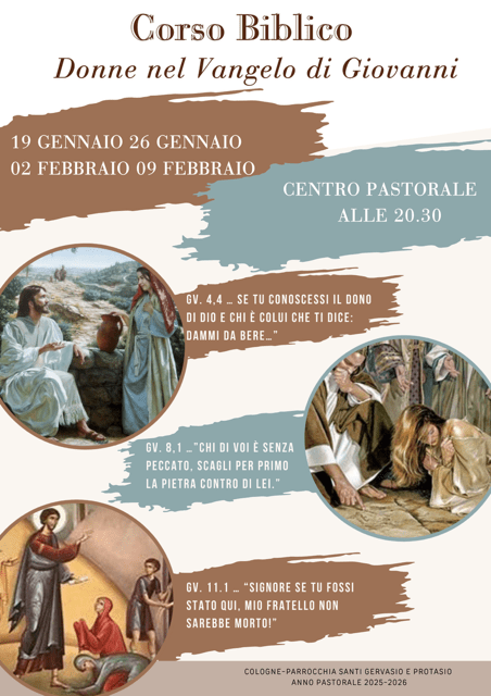 Corso biblico 2026 Postato il 01/17/2026 di Parrocchia Cologne Condividi: Condividi su X (Si apre in una nuova finestra) X Condividi su Facebook (Si apre in una nuova finestra) Facebook Condividi su WhatsApp (Si apre in una nuova finestra) WhatsApp Mi piace Caricamento... Correlati Pubblicato da Parrocchia Cologne Vedi tutti gli articoli di Parrocchia Cologne