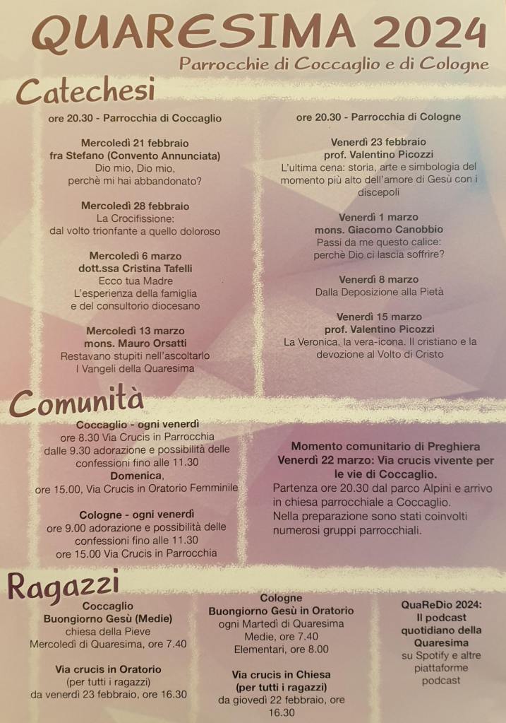 Qui di seguito potrete trovare, giorno dopo giorno, il percorso degli incontri di questa quaresima. Buona visione!